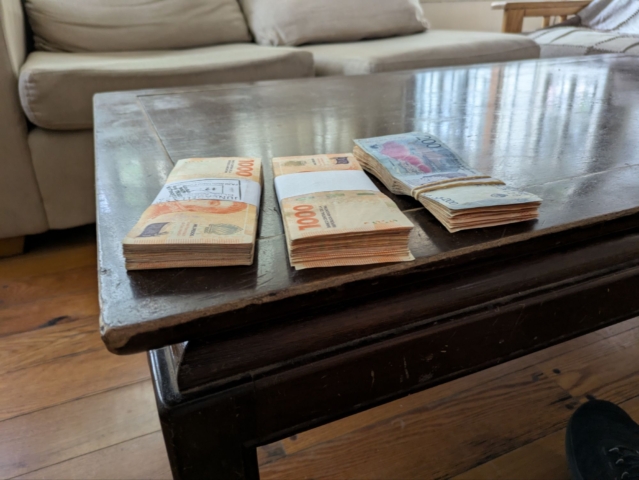 The maximum amount you can withdraw from an ATM is $30.000,- (~ €30,-) but the fee for that ist around $13.000,- (~ €13,-) – also not an option.